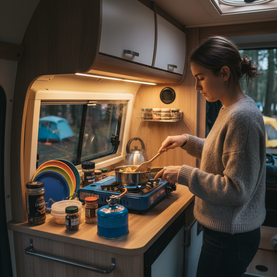 The kitchen makes or breaks daily life in a motorhome. Pull-out storage means no more rummaging for pans, a compact air fryer or induction hob gives you versatile cooking, and soft-close hinges stop noisy cupboards rattling on the road.